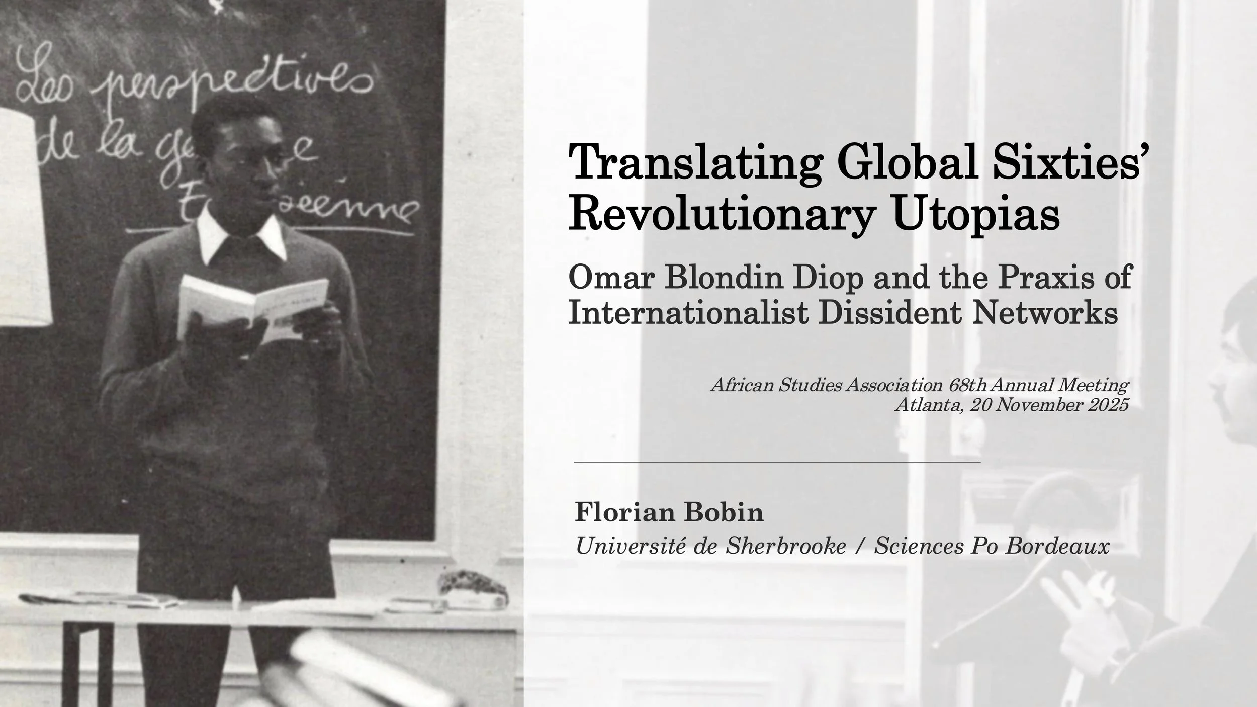 A questioning of the Global Sixties, Omar Blondin Diop, and the translation-praxis relationship, as part of the “Reflections on Wolof Language, Cultural Production, and Activism in a Multilingual Senegal” panel at the African Studies Association 68th Annual Conference in Atlanta on November 20, 2025 at 3:30PM.